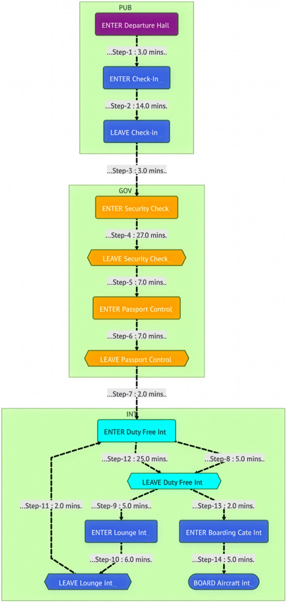 The following excerpt shows a simplified subgraph of the overall process flow for the ”Airport Passenger Flow” example; nodes represent individual steps, while edges encode transitions annotated with their respective metrics. Styling information has been omitted for clarity.